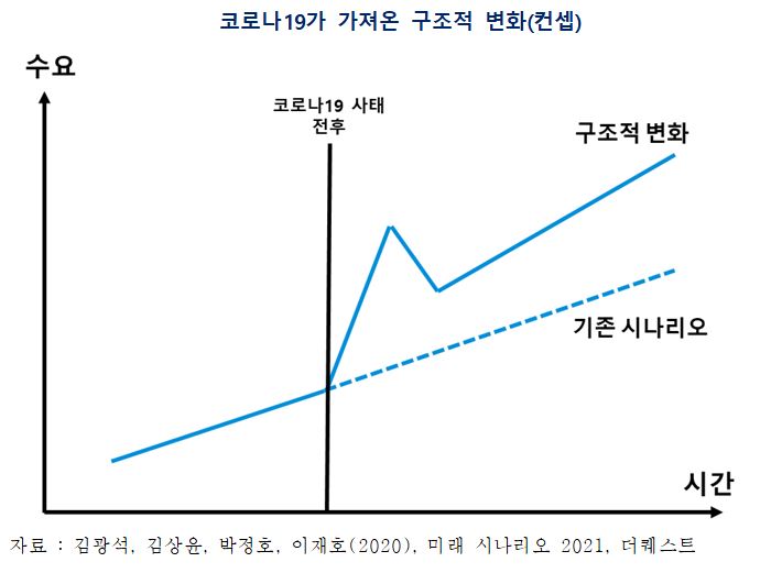 IMF는 2020년 세계경제가 1930대 대공황 이후 가장 흉악한 경제위기를 경험할 것으로 전망했다. 2020년 세계 경제성장률 전망치는 –3.0%다. 코로나19라는 이례적 감염병이 2020년을 휩쓸었다면, 그 자리에는 감염병 대응력이 한층 강해진 나라가 서게 될 것이다. 코로나19로 보건 및 방역시스템에 대한 수요가 급증했다면, 이후 다시 그 자리로 돌아가지 않고 수요의 레벨이 한층 올라간 채로 향후 수요가 이어질 것으로 보인다. 즉 구조적 변화가 나타나는 것이다. 그 밖에도 비대면 서비스나 디지털 플랫폼에 대한 수요가 지속해서 늘어나다가 코로나19의 영향으로 수요가 폭발적으로 증가한 이후, 다시 이전 수준으로 돌아가는 것이 아니라 이전 수준보다 한층 높은 수준으로 자리하게 될 것으로 전망된다. 즉, 코로나19는 일시적 변화만이 아니라 구조적 변화를 가져올 것으로 보인다. 이를 그래프로 표현하면 아래와 같다.