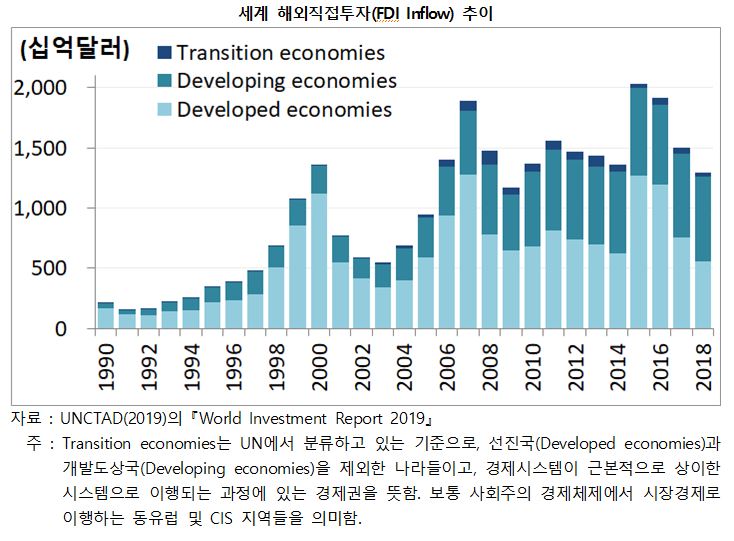 둘째, 글로벌 벨류 체인(Global Value Chain, 이하 ‘GVC’) 상의 변화가 가속화될 것으로 보인다. 보호무역주의가 팽배해지고, 미국을 비롯한 주요국들이 리쇼어링 정책을 추진함에 따라 이미 제조업 회귀현상이 전개되어 왔다. 세계적으로 해외직접투자 유입액(Foreign Direct Investment Inflow)은 2015년 20,338억 달러 규모를 기록한 이후 급속도로 감소하면서 2018년에는 12,972억 달러를 기록했다. 2020년 국내 주력산업들은 코로나19 사태로 주요 부품의 공급에 차질을 빚은 바 있다(중국, 미국, 유럽 등). 코로나19 사태는 GVC 상의 일부 부문을 해외에 의존하기보다 자국에 집중하는 현상을 강화시킬 것으로 보인다. 한국 정부는 주요 정책들 중 하나로 리쇼어링 정책(U턴 기업 지원정책)을 이행하고 있다. GVC가 약화되는 구조적 변화가 나타나는 모습이다.