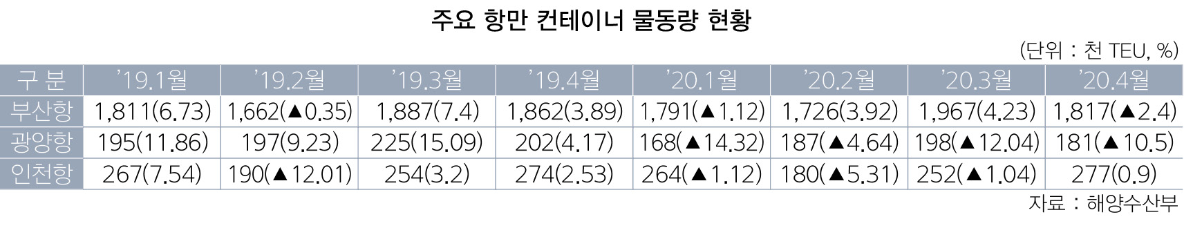 항만별로 부산항은 전년 동월 대비 2.4% 감소한 182만TEU를 처리했다. 수출입 화물은 주요 국가들의 수출입 물동량 감소에 따라 5.5% 하락했다. 부산항의 교역 상위 10개국 중 중국과의 수출입 물동량은 8.6% 증가한 데 반해 미국과 일본은 각각 2.6%씩 후퇴했다. 베트남의 경우 12.7% 줄어들며 두 자릿수 감소율을 보였다. 환적화물은 중국의 단계적 생산라인과 항만 정상화에 힘입어 0.5% 증가한 98만TEU를 기록했다.