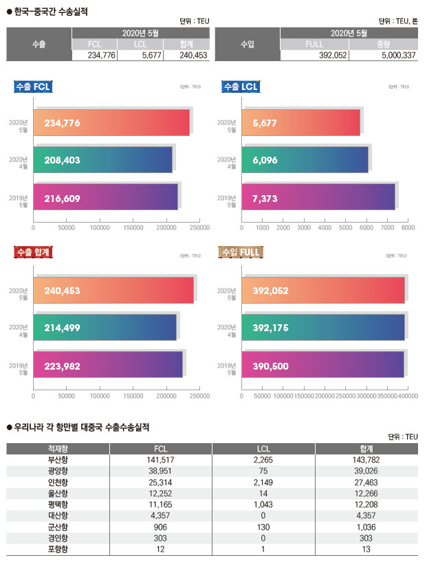 정기항로브리핑/ 한중항로 수출수송실적(2020년 5월/전월/전년)