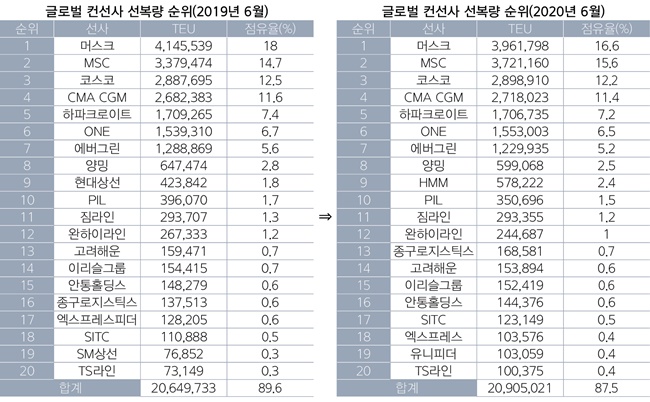 ‘톱 20’ 중 선복량이 10만TEU 이상 늘어난 선사는 MSC와 HMM(옛 현대상선) 두 곳에 불과했으며, 세계 1위 머스크를 비롯한 10곳은 전년에 비해 몸집이 쪼그라든 것으로 파악됐다.
