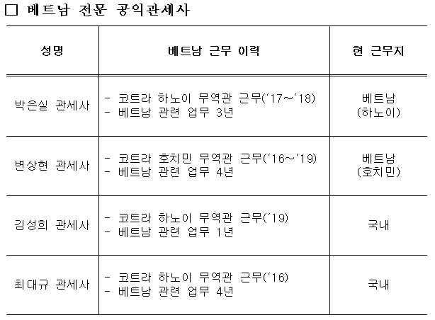 관세청은 코로나19로 어려움을 겪는 기업을 지원하기 위해 베트남 근무 경험과 전문지식을 갖춘 관세사4명을 ‘베트남 전문 공익관세사’로 지난 8일 위촉했다. 공익관세사란 중소·영세기업들을 돕기 위해 관세청이 위촉한 현직 관세사로 국내에 80명이 활동 중이다.