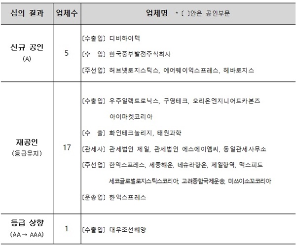 고려종합국제운송 맥스피드 제일항역 미쓰이소꼬코리아 세중해운 등이 수출입안전관리우수업체(AEO) 인증을 재공인 받았다. 특히 대우조선해양은 최고 등급인 AAA로 상향되는 영광을 안았다.