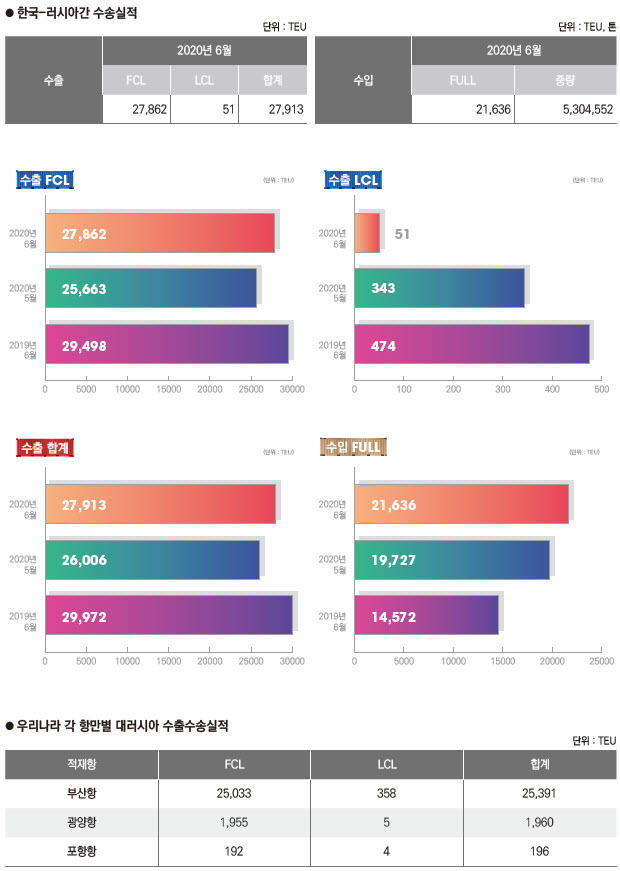 정기항로브리핑/ 한러항로 수출수송실적(2020년 6월/전월/전년)