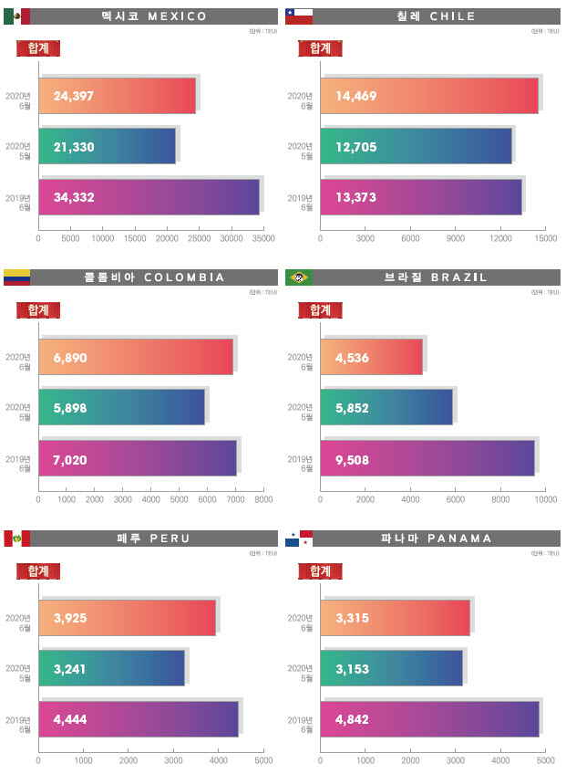 정기항로브리핑/ 중남미항로 수출수송실적(2020년 6월/전월/전년)