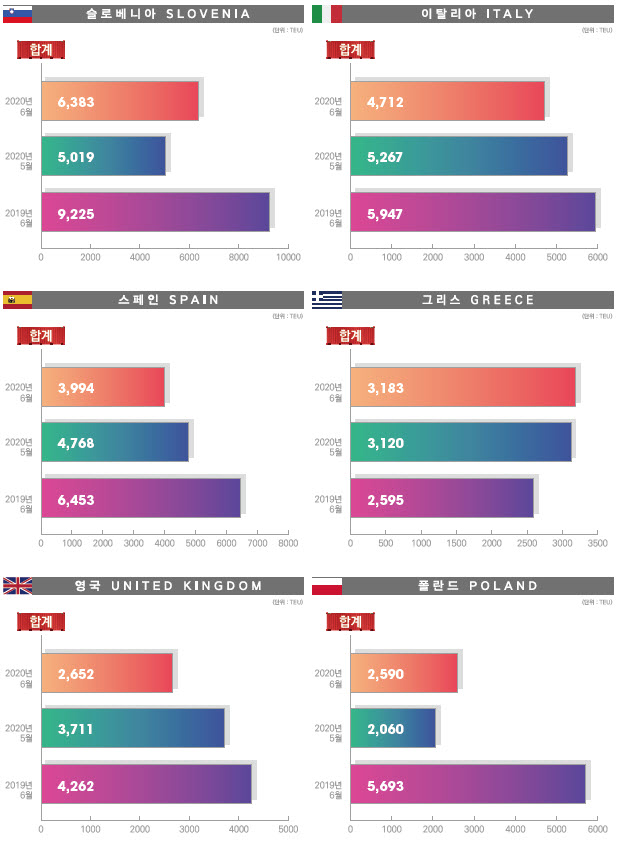 정기항로브리핑/ 구주항로 수출수송실적(2020년 6월/전월/전년)