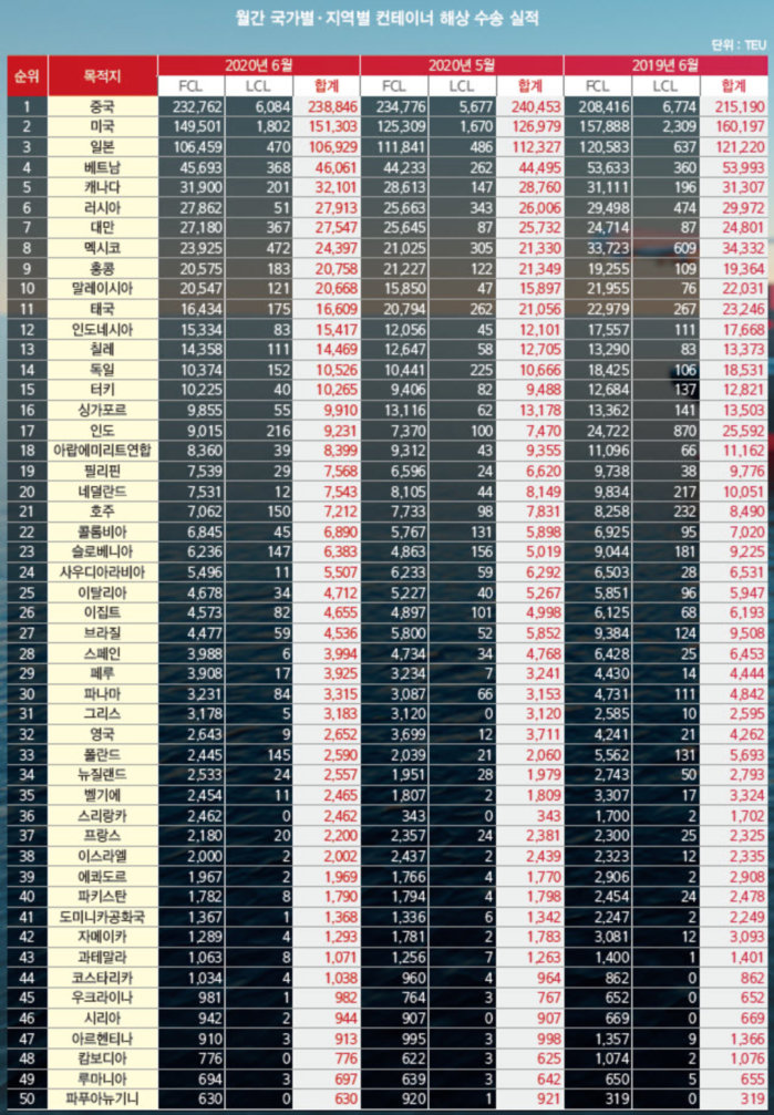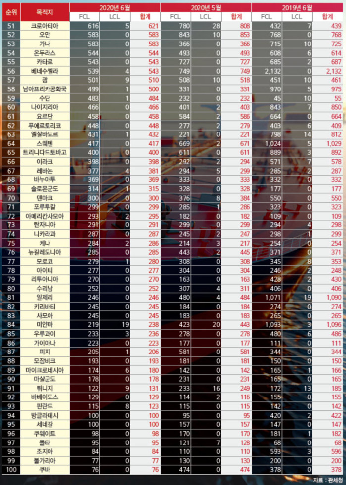 정기항로브리핑/ 월간 국가별 컨테이너 해상수출실적 1~100위 (2020년 6월/전월/전년)