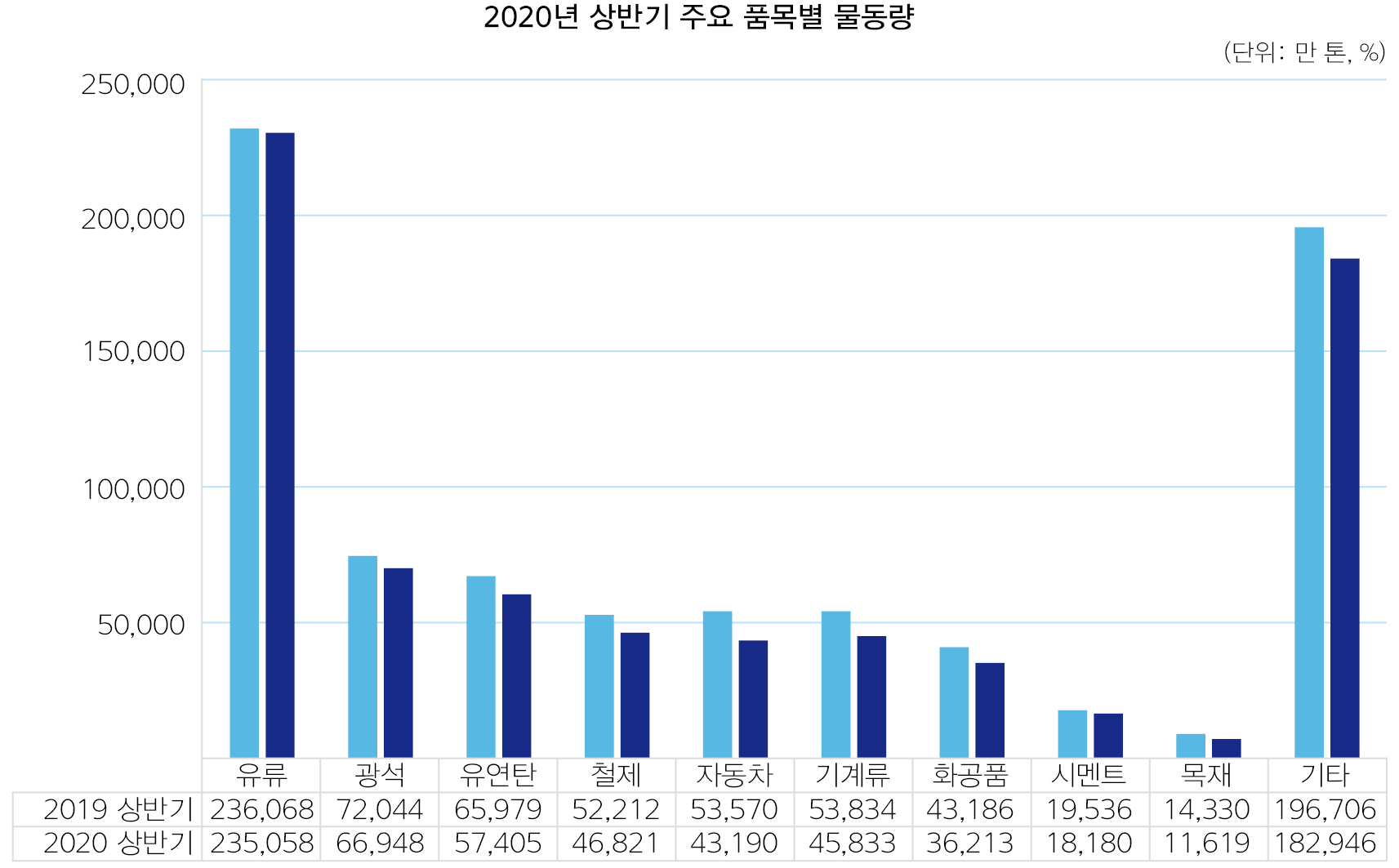항만별로 부산항(12.3%) 광양항(12.2%) 울산항(4.1%) 인천항(0.7%) 평택당진항(4.4%) 등 국내 주요 항만은 모두 후퇴했다. 품목별로 보면 유류 광석 유연탄 철제는 각각 0.4% 7.1% 13% 10.3% 하락했다.