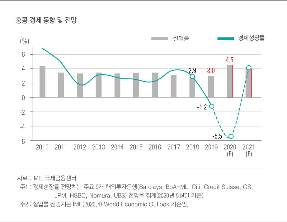 2018년까지 홍콩은 3% 수준의 성장률을 유지하며, 안정적인 경제환경 아래에 있었다. 2019년 홍콩 경제는 -1.2%로 침체 됐고, 2020년 -5.5%로 이중침체될 것으로 전망한다. IMF는 내수 경제를 반증하듯 보여주는 실업률 지표도 2019년 3.0%에서 2020년 4.5%로 급등할 것으로 전망한다.