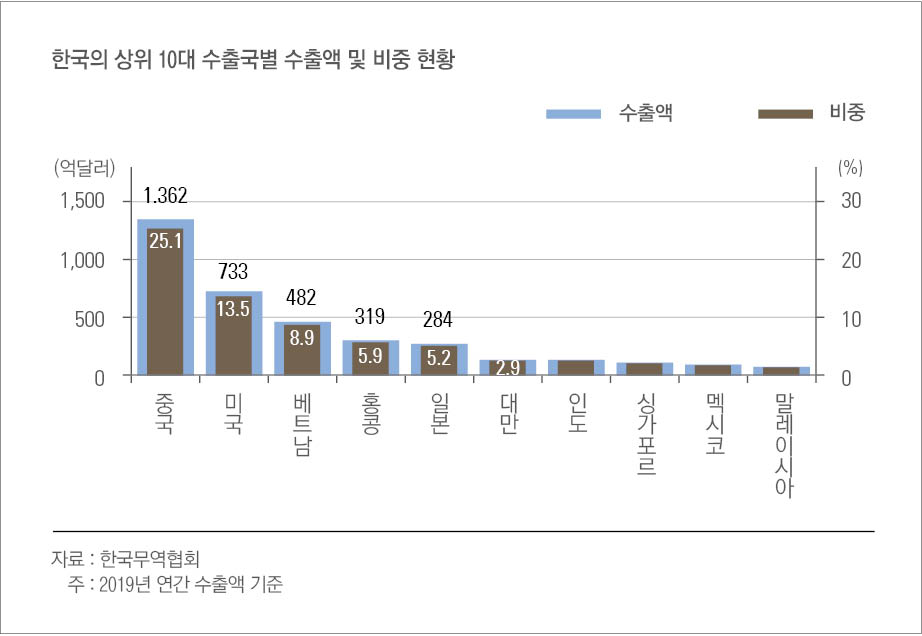 2019년 한국은 홍콩에 319억 달러의 수출 실적을 냈고, 이는 전체 수출의 5.9%나 차지한다. 홍콩은 민주화 시위 이전인 2018년까지만 해도 한국 총 수출액의 7.6%나 차지했다. 2014년 이후로 줄곧 일본 수출액을 초과하고 있다. 또 한 가지 드는 의문은 ‘그렇게 작은 나라에 왜 이렇게 많이 수출하는가?’다. 홍콩은 중계무역의 거점이기 때문이다. 홍콩은 총수입의 89%를 재수출하는 나라다.