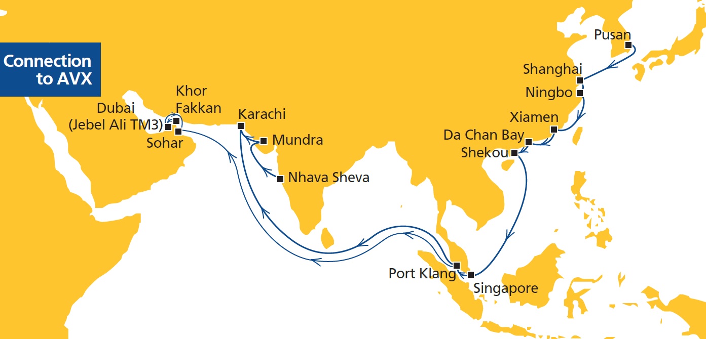 ESL이 선복 임차 방식(슬롯차터)으로 참여하는 AVX는 부산과 블라디보스토크를 매주 1항차 순회하는 노선이다. 고려해운이 342TEU급 컨테이너선 <서니 오크>(Sunny Oak) 1척을 투입 중이다.