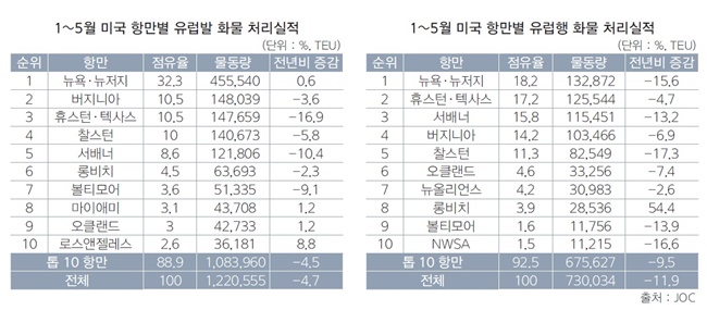 북미 항만들의 컨테이너 처리량도 코로나 여파로 대부분 감소세를 나타냈다. 1~5월 유럽발 화물은 4.7% 감소한 122만1000TEU를, 유럽행 화물은 11.9% 역성장한 73만TEU에 그쳤다. 미국의 수입화물 처리실적에서 가장 높은 증가세를 보인 항만은 로스앤젤레스였다. 반면 휴스턴·텍사스 서배너는 두 자릿수 물동량 감소세를 보이며 희비가 교차했다.