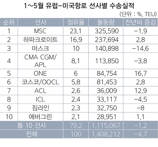 유럽에서 미국으로 가장 많은 컨테이너를 수송한 선사는 스위스 MSC였다. 이 선사는 전년 대비 1.9% 감소한 32만5600TEU를 이 항로에서 실어 날랐다. 미국발 유럽행 컨테이너는 1년 전에 견줘 20% 급감한 14만3100TEU를 수송해 2위에 자리했다. 점유율은 23.1%로 2위 하파크로이트에 6.2%p 앞섰다.