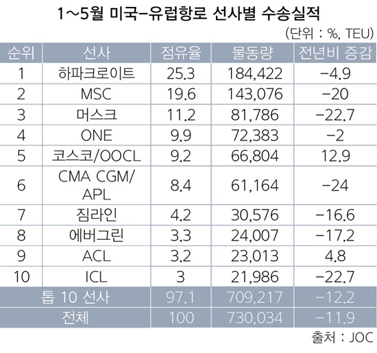 톱 10 선사들의 수송량도 마이너스를 보였다. 물동량 점유율은 79.2%로 전년 동기 76.4% 대비 2.8%포인트(p) 떨어졌다. 같은 기간 미국발 유럽행 수송량도 11.9% 급감한 73만TEU로 나타났다.