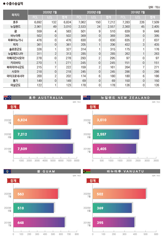 정기항로브리핑/ 호주항로 수출수송실적(2020년 7월/전월/전년)