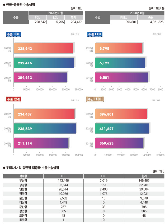 정기항로브리핑/ 한중항로 수출수송실적(2020년 8월/전월/전년)