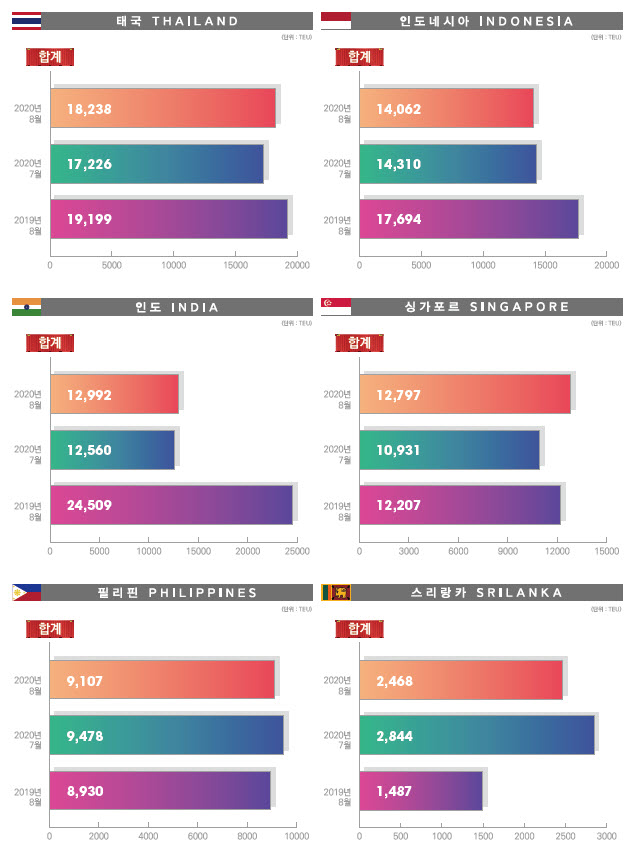 정기항로브리핑/ 동남아항로 수출수송실적(2020년 8월/전월/전년)