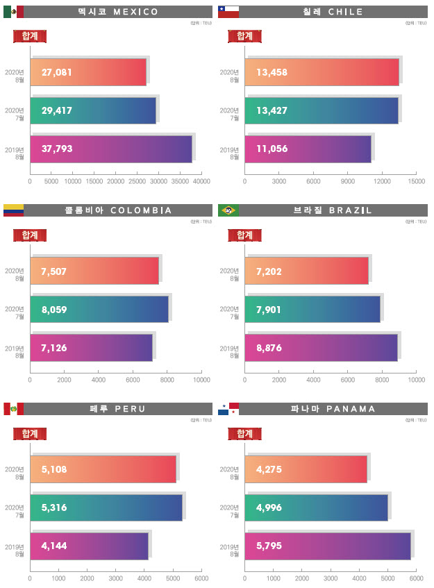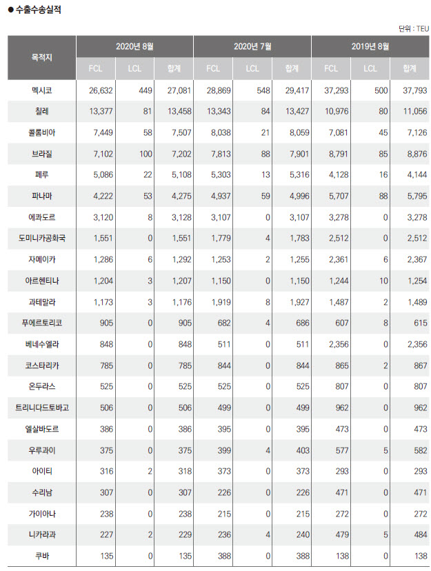 정기항로브리핑/ 중남미항로 수출수송실적(2020년 8월/전월/전년)