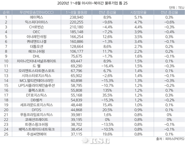 같은 기간 상위 5대 무선박운송인(NVOCC)이 수송한 컨테이너 물동량은 102만800TEU로 집계됐다. 지난해 3위를 기록했던 홍콩 케리로지스틱스 산하의 글로벌 포워더 에이펙스그룹이 1위 탈환에 성공했다. 이 기업의 8개월 누적 컨테이너 물동량은 전년 동기 대비 8.9% 상승한 23만9000TEU를 기록했다.