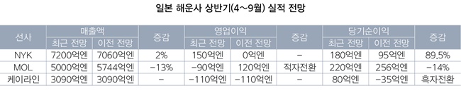 케이라인도 MOL과 마찬가지로 영업이익이 악화될 거란 전망을 내놨다. 이 선사는 매출은 종전 전망과 동일하지만 전년 동기와 비교하면 17% 감소한 3090억엔(약 3조4000억원)을 기록할 것으로 예상했다. 영업이익 역시 -110억엔(약 -1200억원)으로 직전 전망과 동일한 수치를 낼 것으로 관측했지만 전년 동기 110억엔에서 적자전환할 것으로 내다봤다. 다만 순이익은 직전 예상 -35억엔에서 80억엔(약 900억원)으로 흑자전환할 것으로 점쳤다.