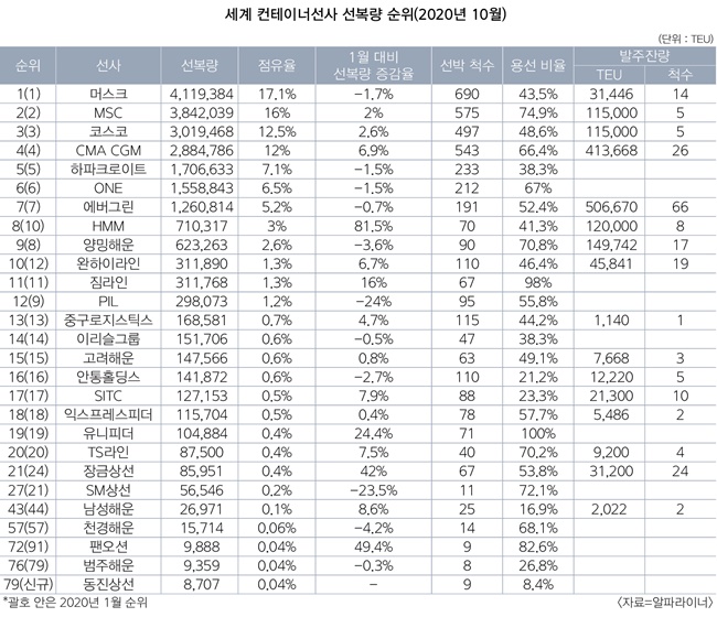 글로벌 선사들의 컨테이너선시장 점유율이 더욱 상승한 것으로 나타났다. 20대 선사들의 점유율은 대형선 도입에 힘입어 90%대에 진입했다. 컨테이너선사들의 선복량 변화 속에서, HMM(옛 현대상선)은 연초 대비 선대를 가장 활발히 확장한 반면, PIL은 축소를 단행해 대조를 보였다.