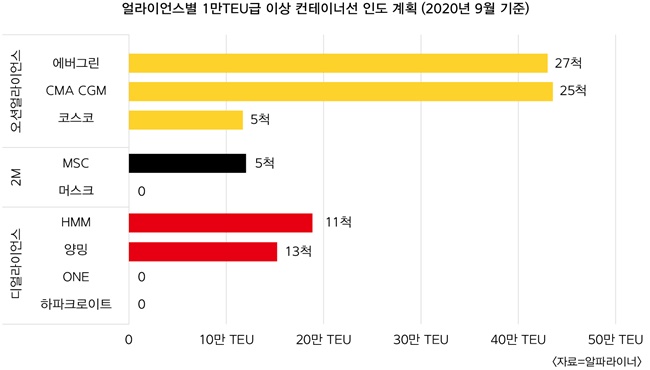 우리나라 HMM을 비롯해 ONE 하파크로이트 양밍해운 4곳으로 구성된 컨테이너선 제휴그룹인 디얼라이언스의 선복량은 2M과 오션에 비해 크게 뒤처진다. 디얼라이언스의 현재 선복량은 459만8200TEU로 향후 신조선을 인도받으면 491만9700TEU로 7% 확대되지만 여전히 800만TEU대인 2M 오션에 300만TEU가량 적은 수준이다.
