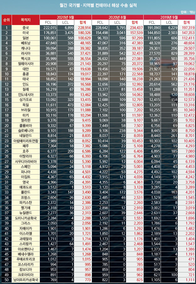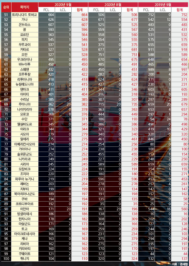정기항로브리핑/ 월간 국가별 컨테이너 해상수출실적 1~100위 (2020년 9월/전월/전년)
