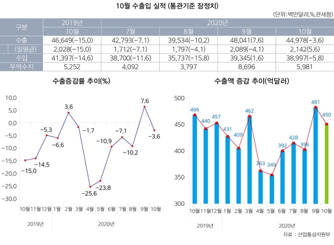우리나라 전체 수출액은 한 달 만에 감소했지만 2개월 연속 400억달러를 웃돌았다. 지난달 수출은 약 449억7800만달러(약 51조원)로 지난해 같은 기간보다 3.6% 감소했다. 추석 연휴로 조업일수가 2일 부족해 총 수출은 감소했으나, 일평균 수출은 5.6% 증가한 21억4000만달러를 냈다. 무역수지는 59억8000만달러로 6개월 연속 증가세를 보였다. 1년 만에 두 달 연속 50억달러를 상회했으며, 9~10월 흑자 규모는 올해 1~2위에 해당한다.