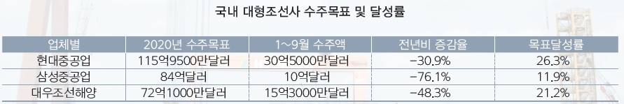 코로나19로 불확실성이 가중된 데다 환경규제를 고려한 선주들이 발주 시기를 관망하면서 조선사들의 수주실적 악화로 이어졌다. 특히 지난해 조선사들의 곳간을 든든히 채워준 컨테이너선 수주가 전무한 데다 액화천연가스(LNG)선 수주량이 크게 감소한 게 악재로 작용하고 있다.