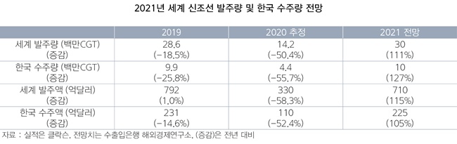 양 연구원은 노후선 교체 압력은 과거 어느 때보다 높아진 상황이지만 선주들 중 일부는 규제 시기에 맞춰 2021년부터 투자를 단행할 것으로 예상했다. 그는 “2021년에도 황산화물 규제에 의한 대량폐선은 이뤄지지 않을 것으로 예상되나 2022년 유럽 배출가스거래제도, 2023년 EEXI 등에 대응한 스케줄로 인도받기 위한 투자가 점진적으로 이뤄질 전망”이라고 밝혔다. 내년 글로벌 수주액 역시 115% 폭증한 710억달러를 기록할 것으로 전망된 가운데 이중 우리나라는 105% 폭증한 225억달러를 확보할 것으로 점쳤다.