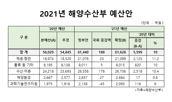 해양수산부는 2021년도 예산(기금 포함) 총지출 규모가 6조1628억원으로 확정됐다고 7일 밝혔다. 올해 예산 5조6029억원보다 10%(5599억원) 확대되면서 해수부 재출범 이후 가장 높은 증가율을 기록했다. 국회 심의 과정에서 정부안인 6조1440억원보다 188억원 늘었다.