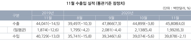 지난달 우리나라 수출액은 약 458억1000만달러(약 49조5900원)로 지난해 같은 기간보다 4% 증가했다. 조업일 부족에도 11월 총 수출액과 일평균 수출액이 모두 증가했다. 세 달 연속으로 ‘총 수출액 400억달러 이상’, ‘일평균 19억달러 이상’, ‘무역수지 50억달러 이상’을 달성했다.