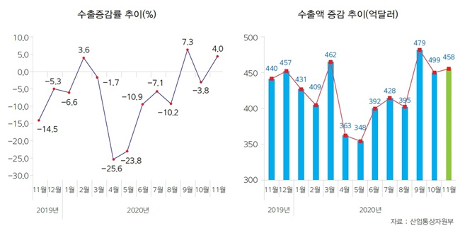 산업통상자원부 성윤모 장관은 “11월은 전년 대비 조업일수가 부족한 가운데서도 수출이 증가한 것은 의미가 있다”며 “특히 우리의 주력 품목인 반도체와 자동차가 최근 수출 회복을 든든히 뒷받침하고 있는 가운데, 비대면경제 특수와 우리 산업의 경쟁력이 시너지를 발휘하며 IT관련 품목들이 상승세를 보이고 있는 점은 앞으로의 수출 활력 회복에 긍정적인 신호”라고 언급했다.