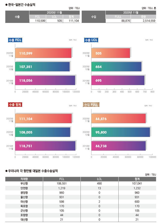 정기항로브리핑/ 한일항로 수출수송실적(2020년 11월/전월/전년)