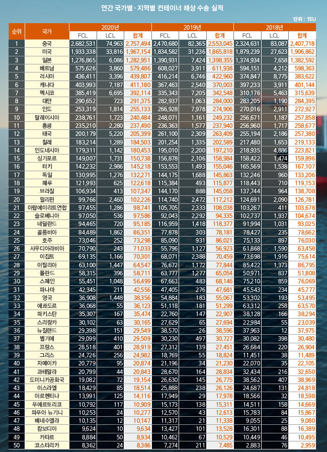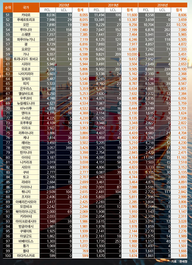 정기항로브리핑/ 연간 국가별 컨테이너 해상수출실적 1~100위