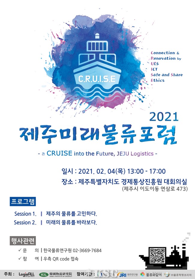 이번 포럼의 키워드는 CRUISE(Connection & Renovation by ULS, ICT, Safe&Share, Ethic)로 제주지역 물류 경쟁력 강화를 위해 표준화 효율화 정보통신기술 사회적가치 공유가치창출 등 다양한 관점을 기반으로 개선 방향을 제시하고자 한다.