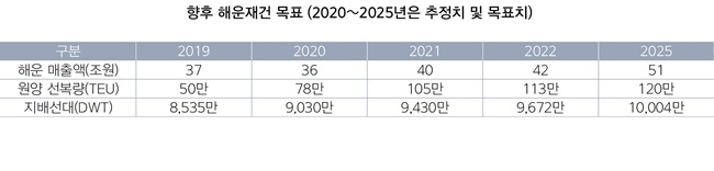 이를 위해 수출 기업의 물류 애로 해소 지원을 강화하는 한편, 국적선사의 서비스 혁신과 한국해양진흥공사의 역할 강화, 해운 인프라 확충 등을 진행한다. 지난해 우리나라는 해운업에서 약 36조원(잠정치)의 매출을 거뒀다. 중장기적으로는 2025년까지 해운매출액 51조원, 원양컨테이너선복량 120만TEU 달성한다는 목표다.