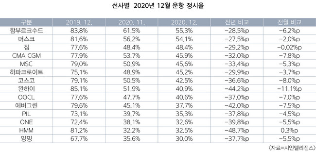 2019년까지 운항정시성은 70~80%대에서 등락을 거듭하며 비교적 안정된 모습을 보였다. 하지만 지난해 신종 코로나바이러스 감염증(코로나19) 사태가 발생하면서 전 세계 해운시장이 동요하기 시작했다.