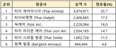 한편 이번에 공개된 통계에서 타이 에어아시아가 약 497만명의 승객을 운송해 점유율 35.7%를 기록하면서 점유율 1위를 차지했다. 녹에어, 타이 라이온 에어, 타이 스마일 항공, 방콕 항공 등이 뒤를 이었다.