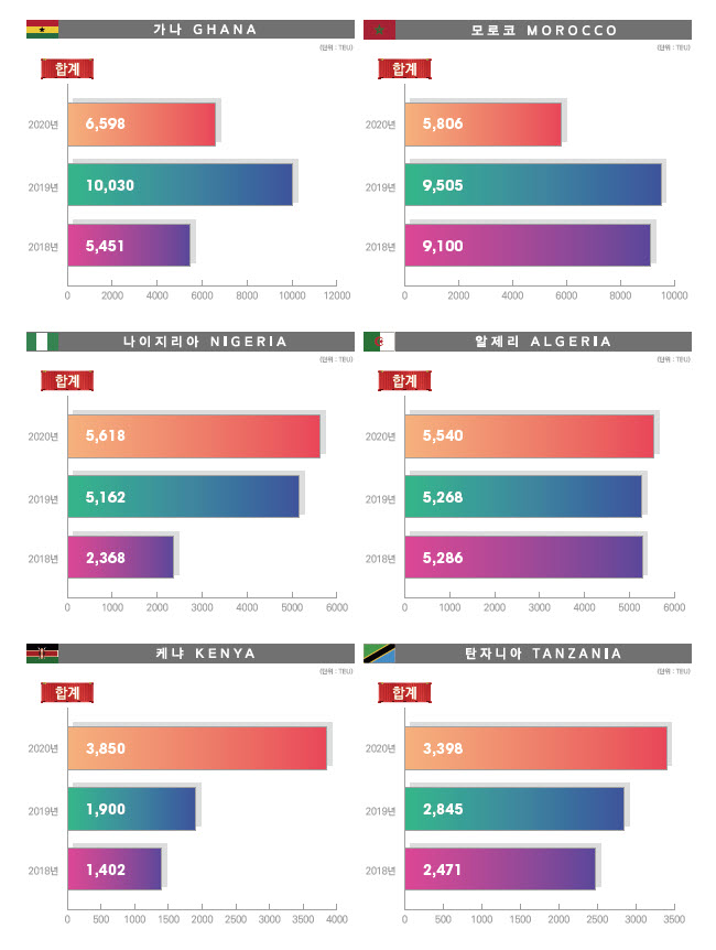 정기항로브리핑/ 아프리카항로 컨테이너 수출수송실적(2020년/전년/전전년)