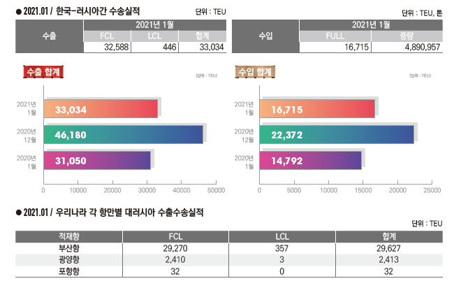 정기항로브리핑/ 한러항로 컨테이너 수출수송실적(2021년 1월/전월/전년)