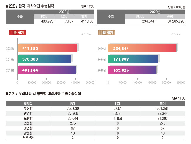 정기항로브리핑/ 한러항로 컨테이너 수출수송실적(2020년/전년/전전년)