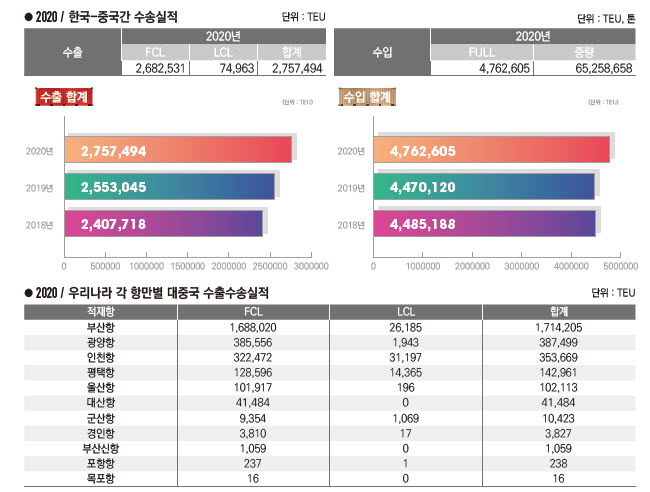 정기항로브리핑/ 한중항로 컨테이너 수출수송실적(2020년/전년/전전년)