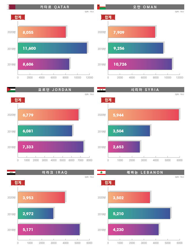 정기항로브리핑/ 중동항로 컨테이너 수출수송실적(2020/전년/전전년)