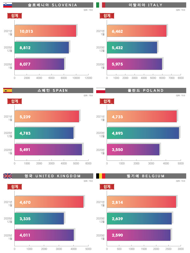 정기항로브리핑/ 구주항로 컨테이너 수출수송실적(2021년 1월/전월/전년)