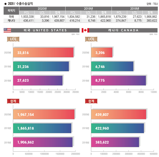 정기항로브리핑/ 북미항로 컨테이너 수출수송실적(2020년/전년/전전년)