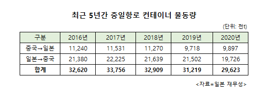 일본 재무성 무역통계에 따르면 2020년 중국-일본 간 해상 컨테이너 물동량은 중량 기준으로 2962만3400t을 기록, 1년 전의 3121만9300t에서 5% 감소했다. 중일항로 물동량은 2018년 3%, 2019년 5% 감소한 데 이어 지난해에도 약세가 이어졌다.