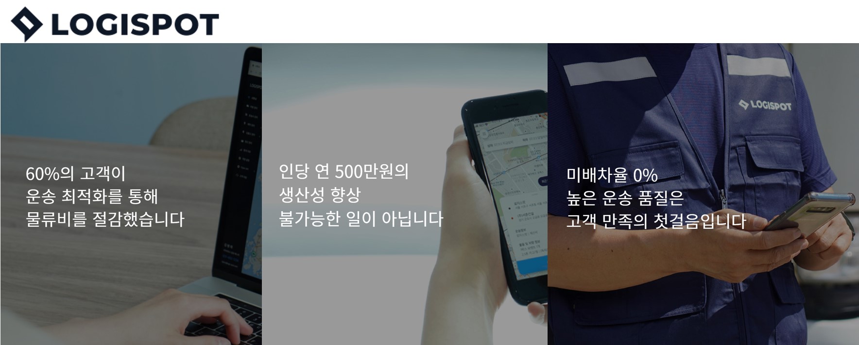 실제 로지스팟 고객사 중 60% 이상이 운송비를 절감하고 있다. 운송업무에서 전화량 최대 75%, 마감 시간은 최대 90%까지 줄어드는 생산성과 업무 효율 향상을 경험하고 있다.