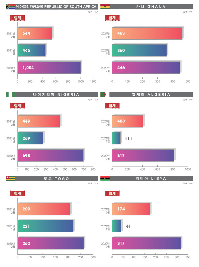 정기항로브리핑/ 아프리카항로 수출수송실적(2021년 2월/전월/전년)