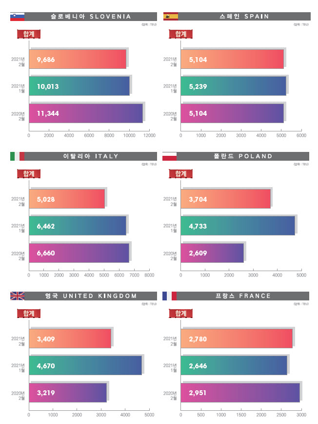 정기항로브리핑/ 구주항로 수출수송실적(2021년 2월/전월/전년)
